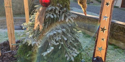 In diesem Jahr hat sich ein ganz besonderer Bewohner in unserem Dorf niedergelassen. Mitten am idyllischen Brunnen reckt sich aus grünen Tannenzweigen ein kleiner Wichtel empor. Mit einer roten Weihnachtskugel als Nase und einer langen Zipfelmütze aus Moos und Heu steht der Geselle ganz frech am Platz.