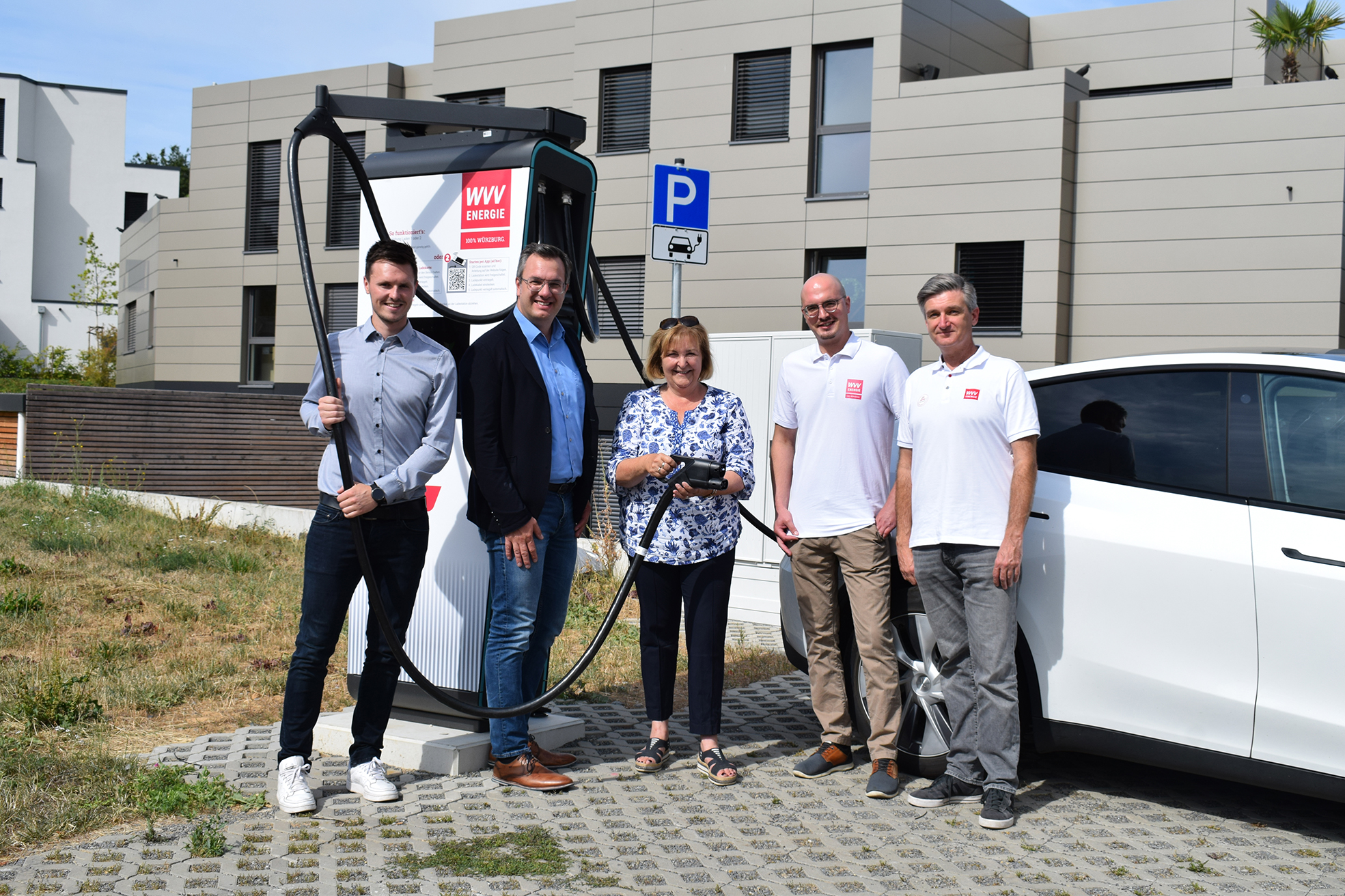 Aktuell betreibt die WVV Energie vier Schnellladestationen, weitere folgen in den nächsten Monaten. Rosalinde Schraud, 1. Bürgermeisterin von Estenfeld, freute sich mit Bernd Hammer, Abteilungsleiter Telekommunikation & Verkehrstechnik, und seinen Mitarbeitern André Nun und Christian Stauder sowie Florian Doktorczyk, Abteilungsleiter Vertrieb der WVV Energie, über die erfolgreiche Zusammenarbeit und den richtigen Schritt in die elektromobile Zukunft.