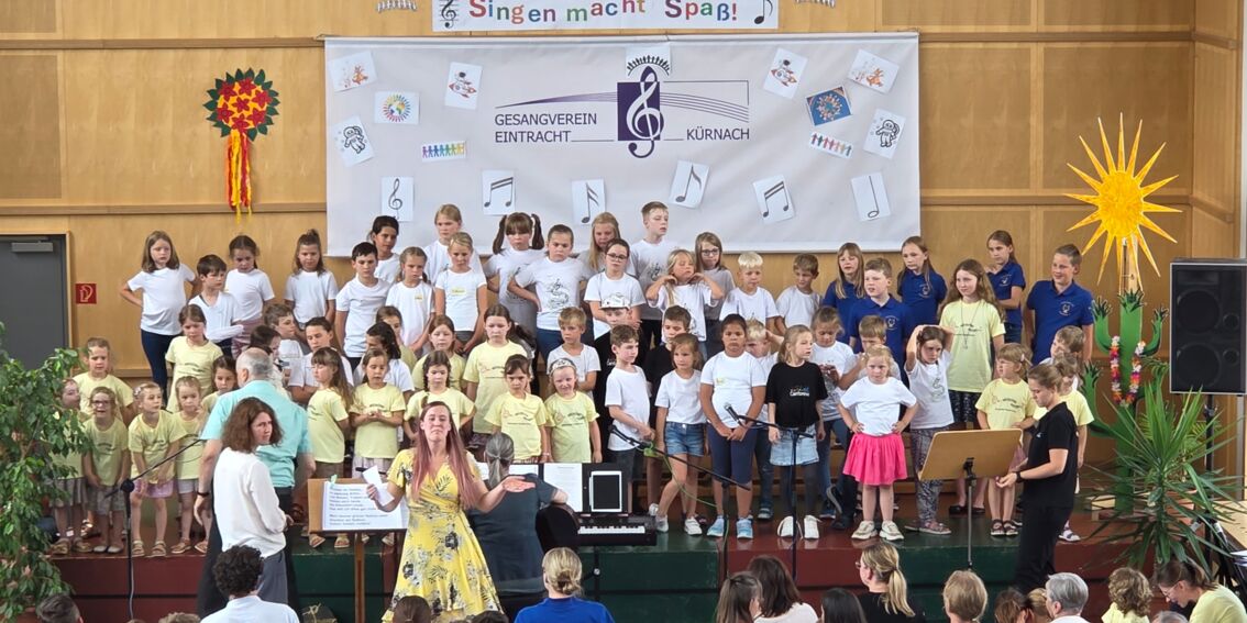 Schon zum dritten Mal hatte der Gesangverein Eintracht Kürnach, organisiert von Moni Hammer, kleinere Kinderchöre der Region zu einem Projekttag eingeladen. Am 13. Juli waren doppelt so viele Kinder und Vereine wie im Vorjahr der Einladung gefolgt: sechs Kinderchöre aus sechs Vereinen des Fränkischen Sängerbund (FSB) mit Ihren Chorleitern: Pauline Walter (Cantonino Bergrheinfeld), Talia von Bezold (Young Voices Kleinlangheim), Alina Melzer (Ohrwürmchen & Ohrwürmer Kürnach), Luisa Scheiner (Young Voices Leinach), Heike Moll-Breunig (Farbenklang Schwebenried) und Valentin Huber (Zeller Chorkids).