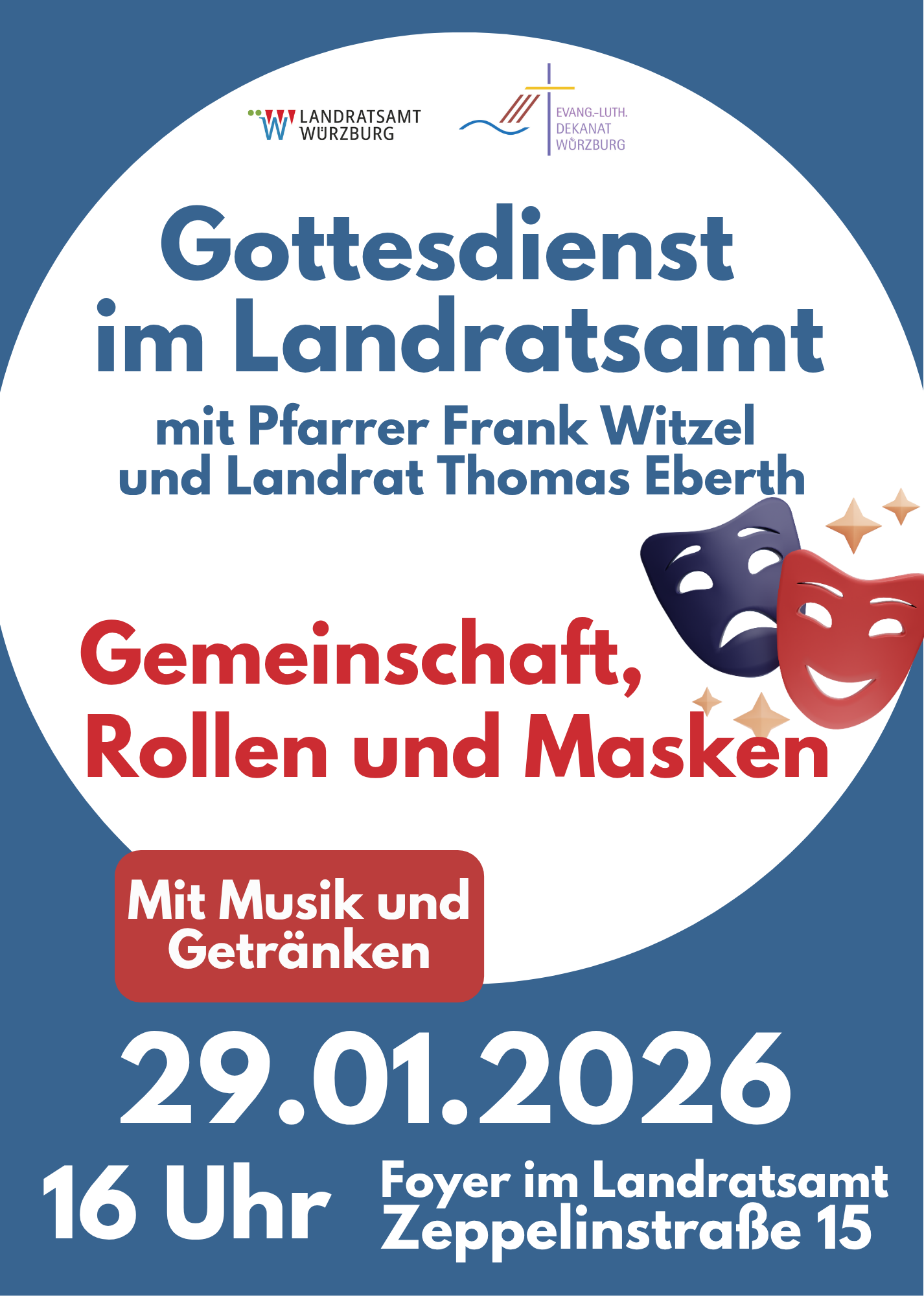 Das Landratsamt Würzburg und das Evangelisch-Lutherische Dekanat Würzburg laden am Donnerstag, 29. Januar 2026, zum Gottesdienst in der närrischen Zeit ein. Unter dem Motto „Kirche an anderen Orten“ findet um 16 Uhr im Foyer des Landratsamts Würzburg, Zeppelinstraße 15, ein besonderer Gottesdienst mit musikalischer Begleitung am Keyboard statt. Verschiedene Kostüme werden bereitgestellt, die Besucherinnen und Besucher können jedoch gerne schon verkleidet erscheinen. Beim anschließenden Beisammensein gibt es außerdem Getränke und Snacks.